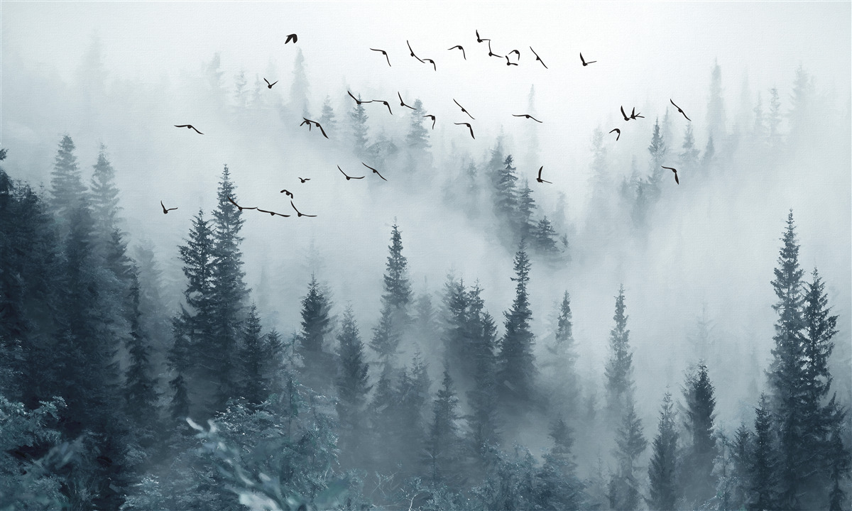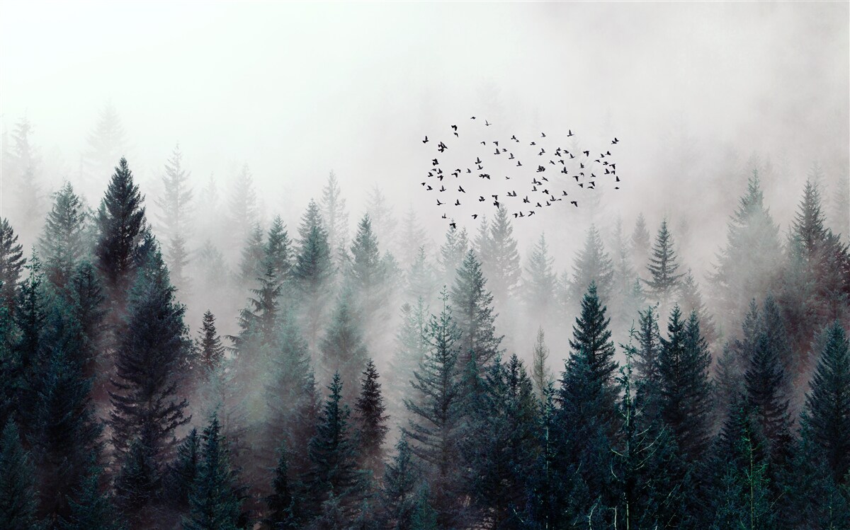 Fotobehang vogels en kerstbomen