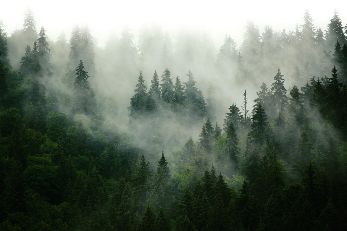 Fotobehang mist sluimert in de dennen